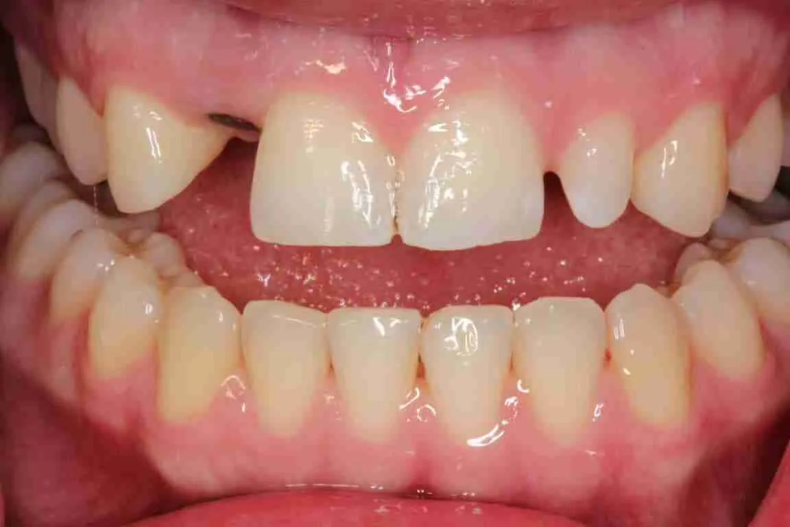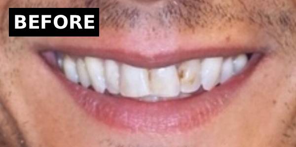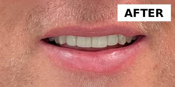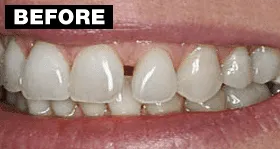 This patient was born without an incisor on the right and a misshapen incisor on the left. His smile was restored with a dental implant and a porcelain veneer.